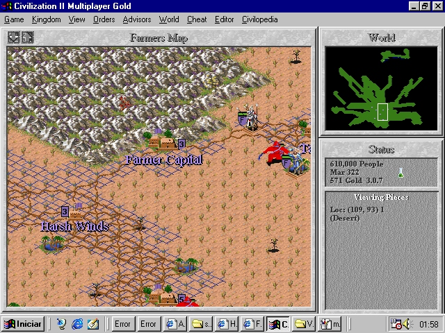 The planet is described as of recent colonization. The game is a struggle for survival and for hegemony on the Desert Planet, with plenty of oppotunities for terraforming and war. I have included the Berbrians and the Farmers as Nomad People (because they can speak in the game). Altough they are very backward in terms of technology, there are many of them, and they are well adapted to the arid climate (because they are natives). The random monsters (barbarians) are a real threat in this game.